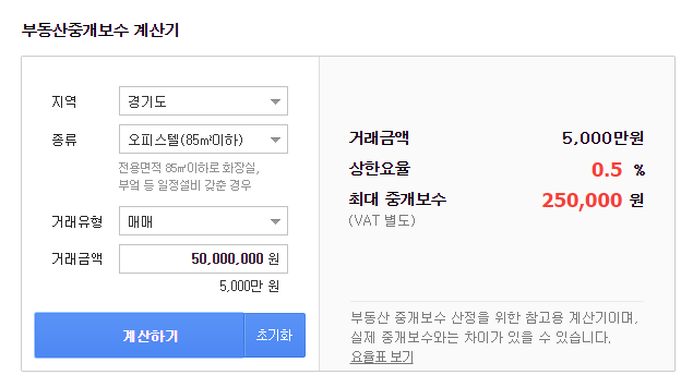 부동산 중개수수료 계산이 어려우신 분들은 다음이나 네이버에서 부동산 중개수수료 계산기 입력하시면 간단히 확인 가능합니다. 주개 수수료 계산 방법은 생각 보다 쉽습니다. 아래와 같이 지역 예를 들어 경기도를 입력합니다. 그다음 부동산의 종류를 선택해주세요 오피스텔을 저는 선택했습니다. 거래 유형을 매매 또는 임대중에 하나를 선택해주시고요. 거래 금액을 입력해주세요 저같은 경우는 거래금액 5천만원을 입력했습니다 그다음 계산하기를 입력해주세요 계산하기를 입력해주시면 우측에 거래금액 상한 요율 그리고 최대 중개 보수 25만원이 표시되게 됩니다. 참고로 하단에 중개요율표가 첨부되어 있으니 참고하시면 좋을것 같네요.