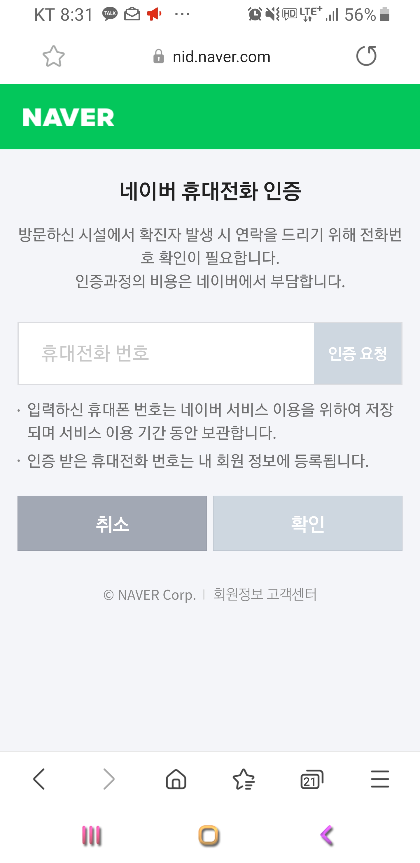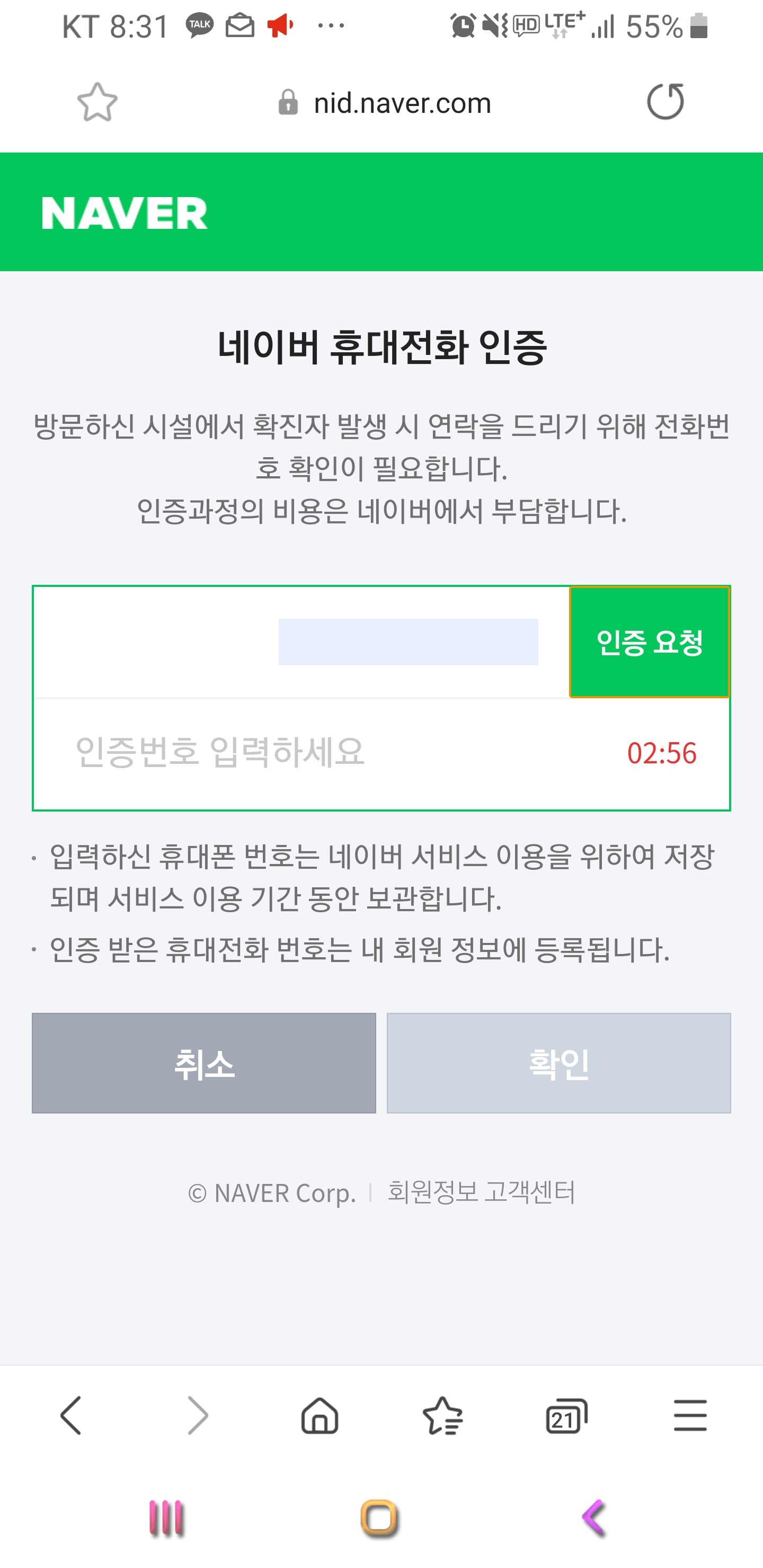 그다음 화면은 네이버 휴대전화 인증 화면이 됩니다. 인증번호를 입력하시면 확인 버튼을 눌러주시기 바래요.