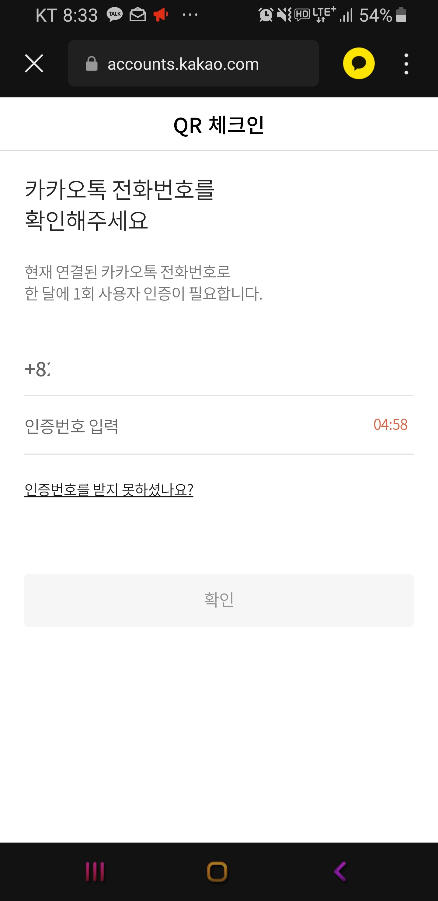 이제 아래 화면에서 자동적으로 본인의 휴대번호가 입력되어 지네요. 그런 후에 인증번호 받기를 누르세요. 그러면 본인 폰으로 인증번호가 오게 되면 자동적으로 인증번호가 입력 되게 되죠. 확인 버튼을 누르세요.