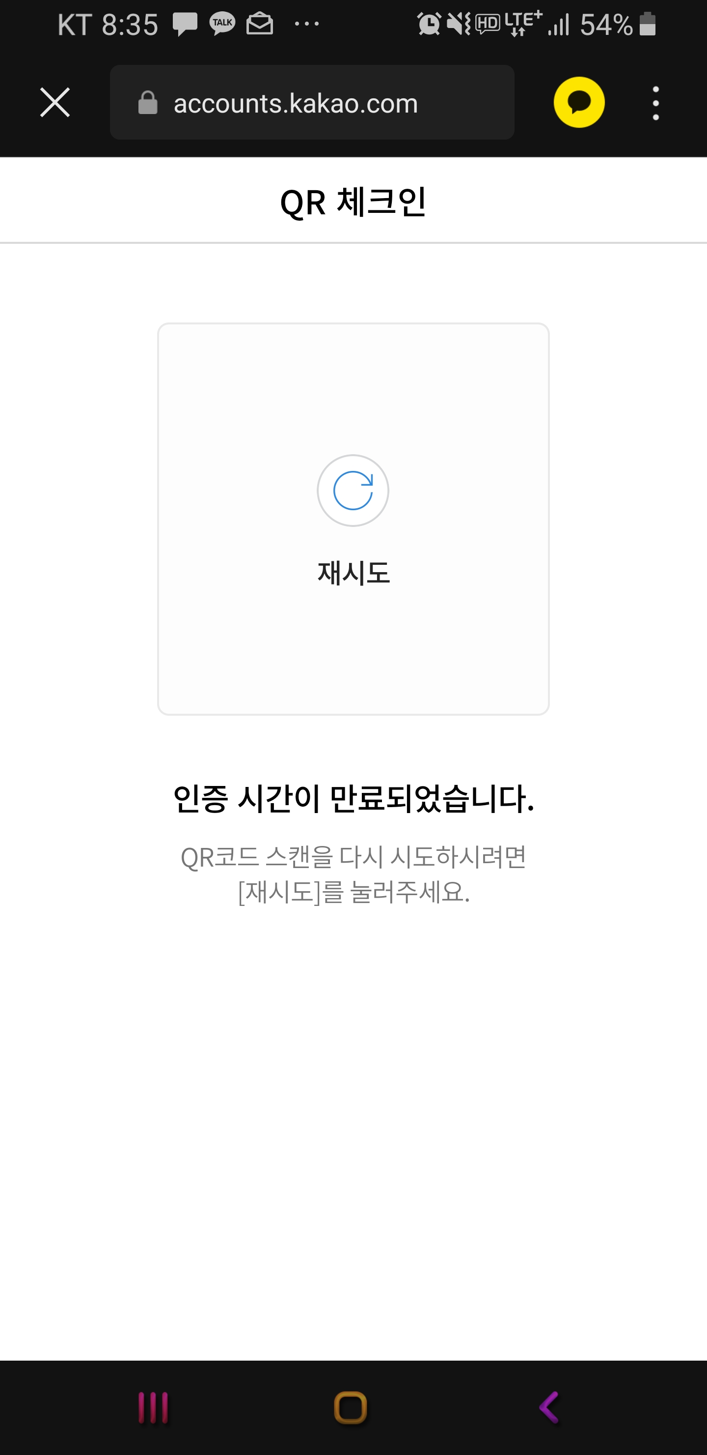 이제 총 45초 동안 큐알 코드가 발행되어 있게 됩니다 45초 뒤에는 아래와 같이 재시도 화면이 나오게 되네요. 재시도 버튼을 클릭하게 되면 자연스럽게 큐알 코드가 재발행 되게 됩니다. 생각보다 쉽네요
