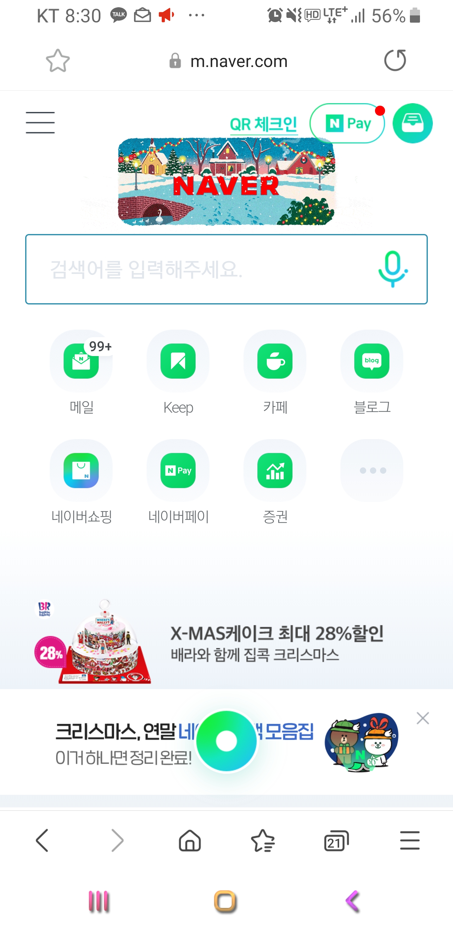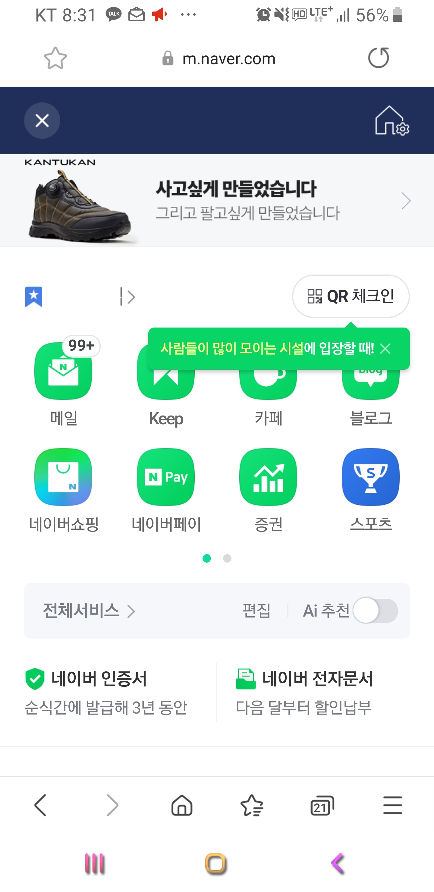다음화면으로 가면 아래와 같이 네이버 메일 카페, 블로그 등등이 표시되네요 우측 상단에 QR 체크인을 클릭해주시기 바래요