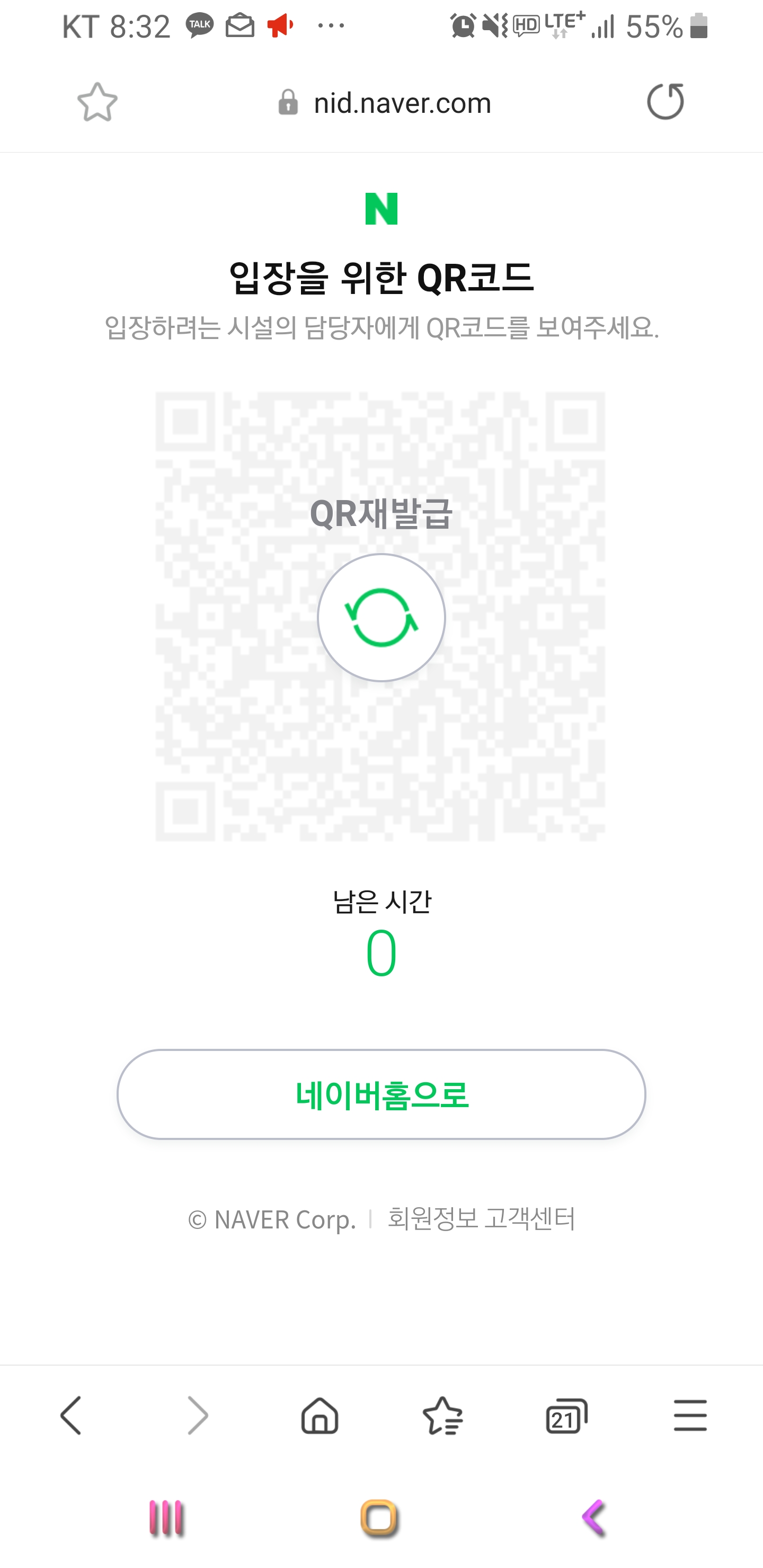 최종 30초 뒤에는 아래와 같이 재 발급 화면이 나오게 되며 재발급 버튼을 클릭하게 되면 자연스럽게 QR 코드가 재발급 되네요.