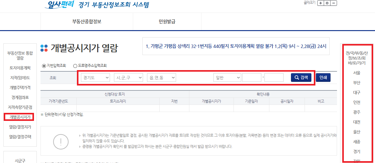 위 사이트에 접속하여 개별 공시지가 화면을 선택 해줍니다.