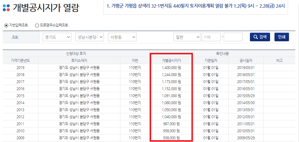 검색을 누르 지면 아래와 같이 해당 주소의 개별 공시지가가 표시되게 됩니다.