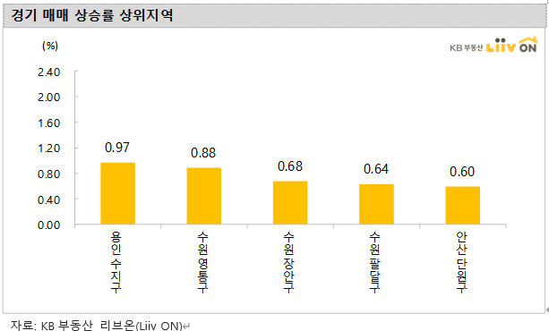 용인 수지, 수원 영통, 장안, 팔달구 지역에 아파트 매매 변동률이 높네요.