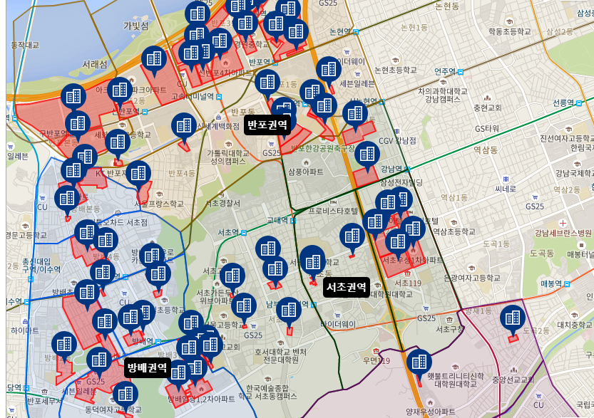 한강변 반포 대부분 지역과 강남역을 주변으로 한 일부 지역 방배동 지역이 대부분을 이루고 있네요.