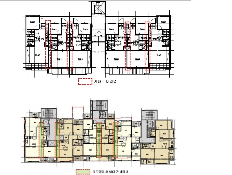 가장 큰 이슈가 되는 부분이 수직증축 리모델링 시 내력벽의 일부 철거가 이슈였습니다.