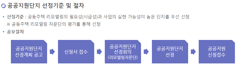 성남시 리모델링 지원 절차는 아래와 같네요. 공공 단지 선정계획 공고, 신청서 작성, 공공 지원 단지 선정, 공공 지원 신청 접수 절차로 단지를 선정하게 됩니다.