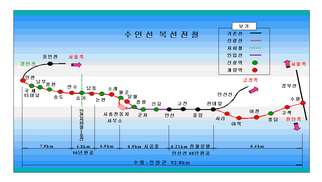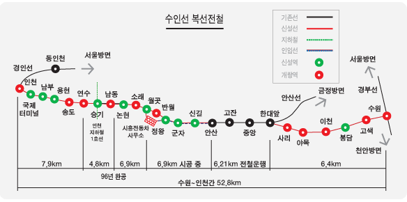 수인선 복선 전철은 인천에서부터 남부, 용현, 연수 역 등으로 이어지는 구간에서 군자 안산 중앙, 사리 봉담