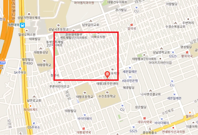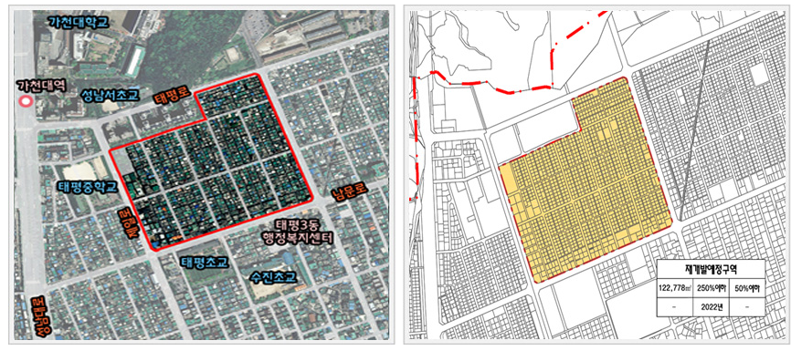 태평 3구역은 경사지로 구성되어 있으며 주변에 가천대학교 분당선 가천대 역이 있습니다.