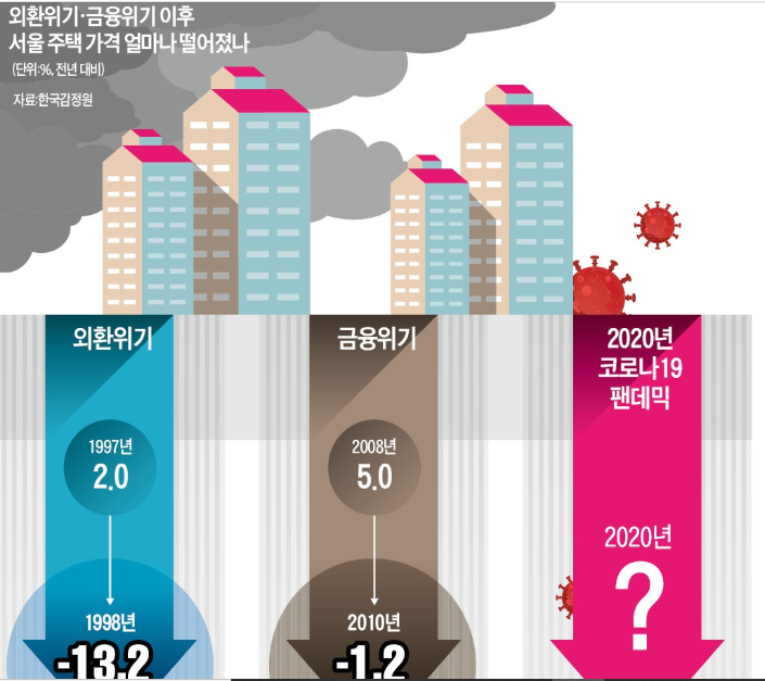 ‘집=안전자산’이란 공식이 유효할지도 미지수다. 안전자산으로 꼽히는 미국 채권과 금값도 이날 줄줄이 급락해서다. 한국은행이 금리 인하 가능성을 내비쳤지만 유동자금이 부동산 가격을 끌어올릴지는 불확실하다. 함영진 직방 빅데이터랩장은 “코로나 19 확산으로 실물경제가 망가지면 금리를 낮춰도 집값 하방 압력은 커질 것”이라며 “2008년보다 영향이 더 클 수도 있다”라고 분석했다.