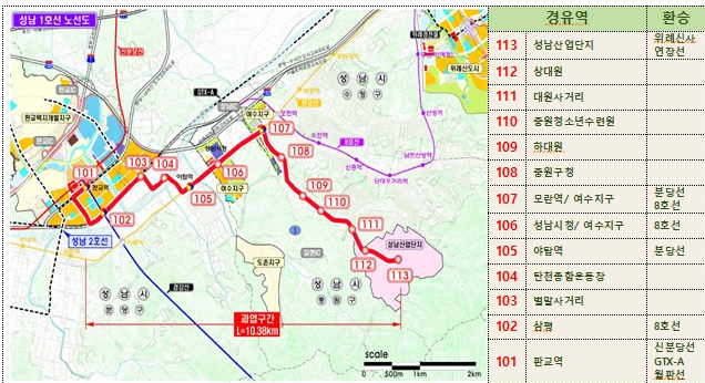 현재 계획상에 성남 1호선은 판교역에서 성남 산업단지를 잇는 연장 총 10,38km에 달하며