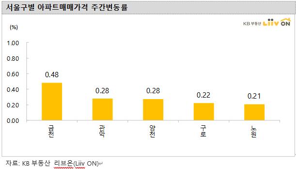 서초 0%, 강남, 0.01%, 강동 0.08%, 송파 0.1%, 마포 0.06%, 용산 0.08% 상승률로