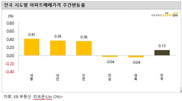 지방의 경우 세종이 0.41% 상승 나머지 지역은 보합으로 보시면 될것으로 보입니다.