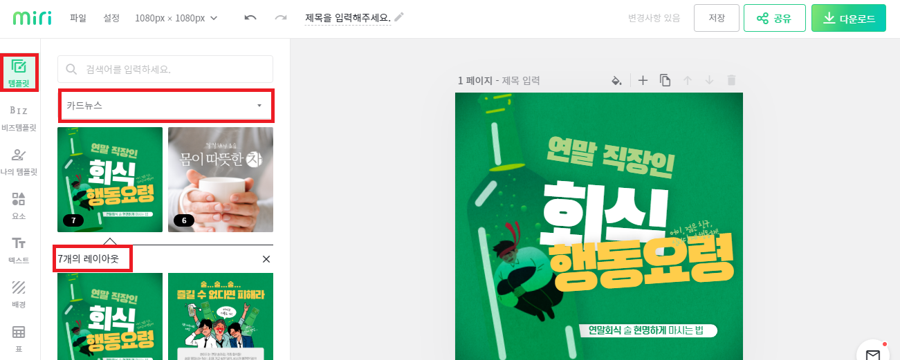 저는 썸네일을 만들생각인 템플릿에서 카드 뉴스를 선택하죠.