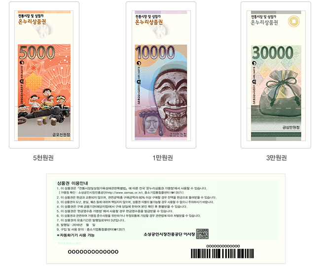 상품권 종류는 아래와 같이 종이 상품권 권종은 5000원, 10000원, 30000원 이 있네요.