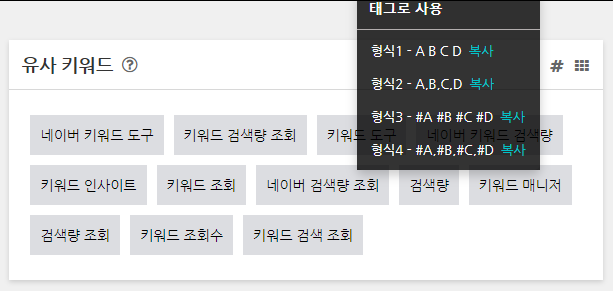 추가 팁으로 유사 키워드에 # 아이콘을 클릭하면 유사 키워드를 여러 형식으로 복사하실 수 있습니다.