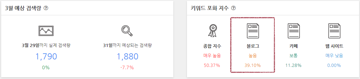 그리고 제일 중요한 월간 검색량 과 월간 콘텐츠 발행량이 표시됩니다.