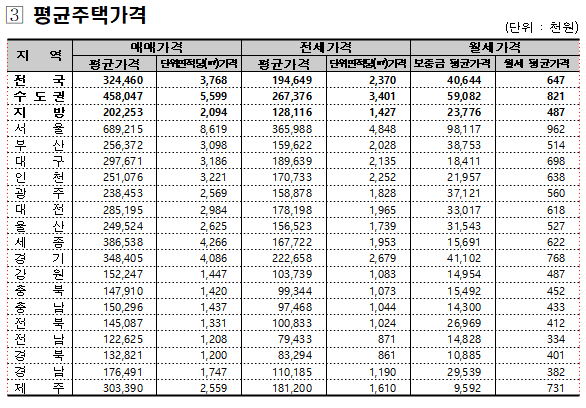ㅇ (지방) 세종(2.63%)은 신규 입주물량 감소에 따른 매매가격과 동반하여, 대전(0.72%)은 학군 및 교통 우수한 지역 위주로 상승폭 확대되나, 제주(-0.25%)·경북(-0.02%)·부산(-0.01%)은 신규 입주물량, 경기 침체 등으로 하락