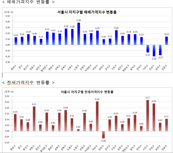 - (서울 강북14개구) 노원(0.38%)ㆍ도봉(0.28%)ㆍ강북구(0.28%)는 소형ㆍ저가 단지 및 정주여건 양호한 뉴타운 대단지, 개발호재(역세권 복합개발 및 교통망 확충 등) 있는 지역 위주로 상승하고, 마포구(0.25%)는 재개발 이주(공덕1구역) 등으로 상승세 이어가나 인기지역 고가 아파트 하락 영향으로 상승폭 축소