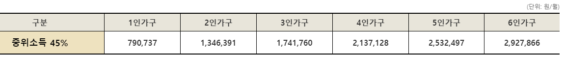 소득인정액 기준 중위소득의 45% (4인 가족 기준 213만원) 이하 가구가 대상이 되네요.