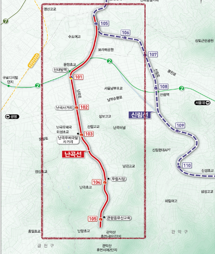 현재 서울의 경전철 계획 중 하나로 신림선의 지선으로 난곡선이 계획되어 있네요.
