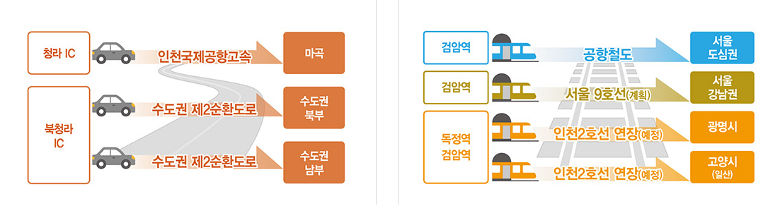주변 교통상황을 말씀드리면 검암역에 공항 철도와, 인천 지하철 2호선(예정), 9호선 연장이 계획되어 있네요.