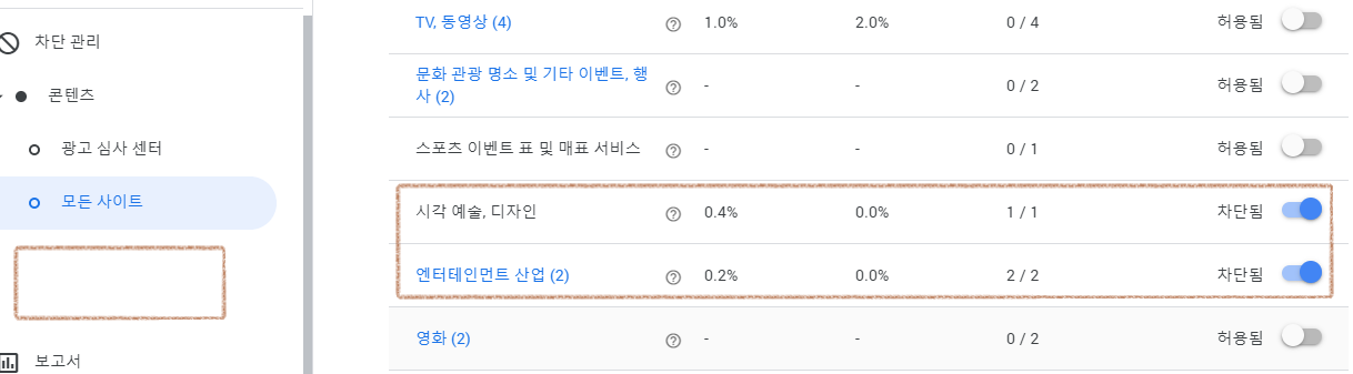 애드센스 광고 중에 아래와 같이 차단 관리 항목에서 모든 사이트 선택하여 일반 카테고리 항목에서