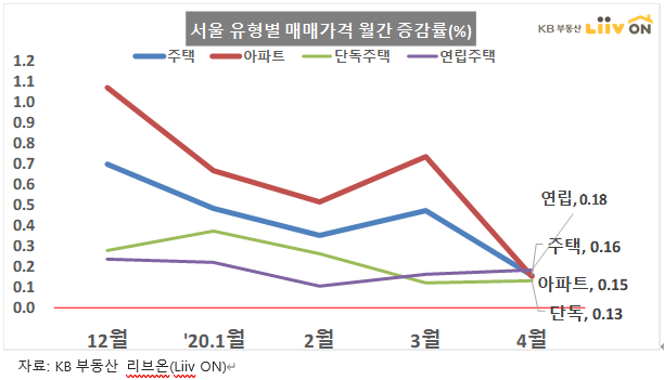 서울시의 유형별 매매 가격은 연립 0.18, 주택 0.16, 아파트 0.15등으로 전반적으로 매매가격 상승이