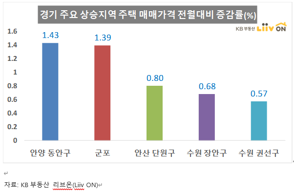 경기도의 주요 상승지역 주택 매매가격으 보면 안양 동안구와 군포 가 1.43, 1.39 %로 전월대비