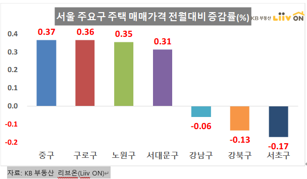 서울 주요구 매매가격 상승률의 경우는 중구 0.37 구로구0.36 노원구 0.35 서대문구 0.31