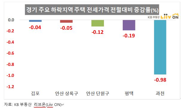 경기도 주요 전세가격 하락지역의 경우는 과천이 -0.98%로 하락세가 두드러 집니다.