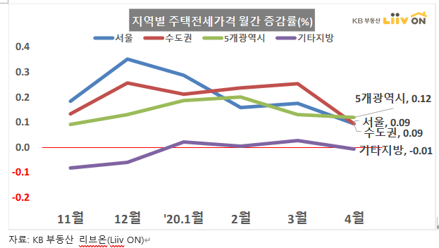 지역별 주택 전세가격 월간 증감률을 보면 서울 0.09, 수도권 0.09 지방 -0.01 %로