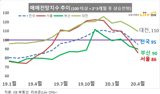 지금은 서울 86, 부산 90, 전국 95 등으로 매매 전망 지수를 부정적으로 보는 시간이 많아졌습니다.