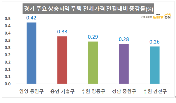 경기도의 경우는 안양 동안구가 전세가격 0.42%, 용인 기흥구 0.33%, 수원 영통구가 0.29%,