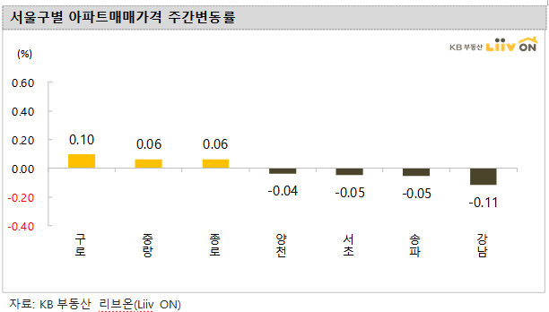 서울 구별 아파트 매매 가격 역시 구로이 0.1%, 중랑구가 0.06%, 종로구가 0.06% 상승했으며