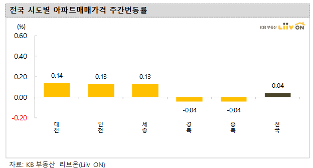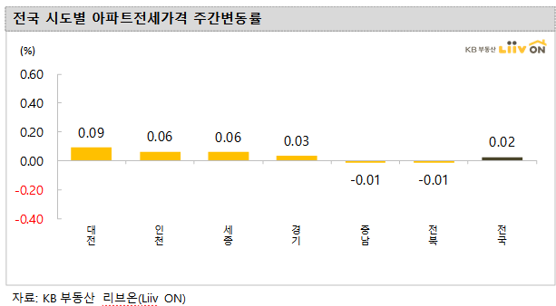 전국 시도별 아파트 전세 가격 역시 대전이 0.09%, 인천이 0.67%, 세종이 0.06% 상승을 보이고 있습니다.