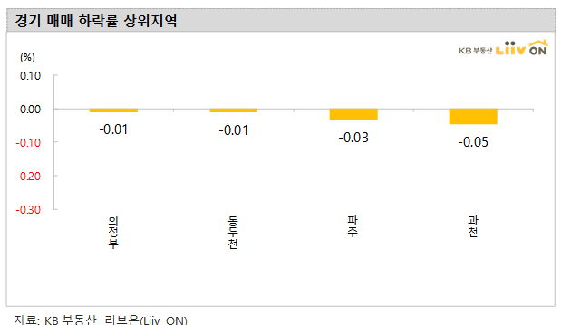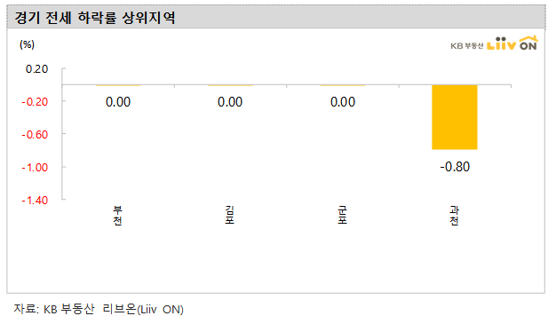 경기도 전세 하락률 상위지역 내용을 보면 부천 0.00%, 김포 0.0% , 과천이 -0.8%입니다.