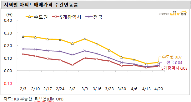 수도권이 0.07, 전국이 0.43%, 광역시는 0.03% 상승으로 상승은 이어져 오고 있으나 그 폭이