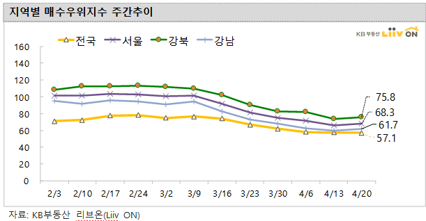 서울이 61.7 강남이 61.7, 전국이 57.1 등으로 지난주에 이어 하락세를 이어 갔네요.