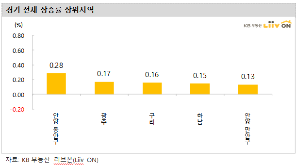 전세 가격은 안양 동안구 0.28%, 경기도 광주가 0.17%, 구리이 0.16% 등을 나타내고 있네요