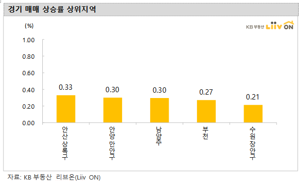 안산이 0.33% 상승하고 안양시가 0.3%, 남양주시가 0.3% 등으로 상승률이 높게 나타났네요.