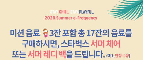미션 음료 3잔 포함 총 17잔의 음료를 구매하면 스타벅스 서머 체어 또는 서머 레대백을 주네요/e 프리퀀시 적립 기간 과 증정품 기간이 동일하니 반드시 이벤트 기간에 증정품 교환이 피요하네요