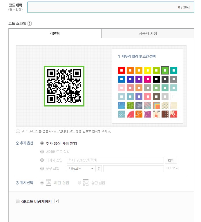 2. 나만의 개성 있는 QR코드 이미지를 만들고 싶은 경우 테두리의 컬러를 변경하거나 나만의 문구 삽입 및 나만의 이미지 첨부, 네이버 로고 추가 등을 통해 개인의 취향대로 스타일을 만들 수 있습니다.