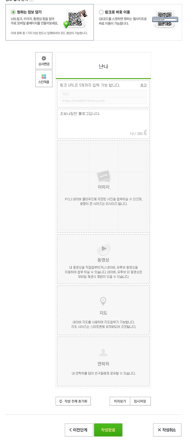 나만의 QR 코드 만들기를 선택해주세요. 아래와 같은 화면이 나오면 코드 제목을 원하는대로 입력해주세요. 원하는 정보 담기를 선택해주세요. 저는 저의 블로그 사이트 정보를 기재했습니다. 그러고 나서 작성 완료를 입력하면 QR 코드가 생성됩니다. 생각보다 어렵지 않지요?