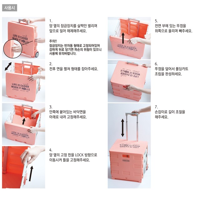 할 리프 폴딩 카트 사용 방법이에요. 양평의 잠금장치를 살짝 벌리며 앞으로 밀면 해제가 가능하네요. 주의사항으로 잠금장치가 반자동이라 반대로 강하게 젖히면 고장이 날 수 있다고 하네요. 전후면을 펼쳐 형태를 잡아주고요. 안쪽에 있는 바닥면을 아래로 내려 고정시켜 주네요. 양옆의 고정핀으로 고정시켜주고요. 전면부의 뚜껑을 위로 올려 빼주게 되면 뚜껑을 듶게 되면 조립이 완성되게 되네요. 손잡이를 자기 몸에 맞춰서 조절해 주면 되네요. 간단하게 조립이 가능하네요. 분해는 위에 언급한 순서의 역순으로 진행하면 될 것 같네요.