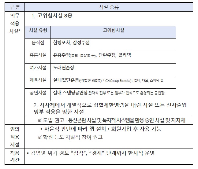 이번에 전자 출입 명부 적용 시설로 지정된 곳은 고위험 시설 8종으로 헌팅포차, 감성 주점 등을 포함한 음식점, 유흥주점, 클럽, 룸살롱, 단란주점, 콜라텍, 노래방, 체육 시설(실내 집단 운동시설로 GX, 줌바, 태부, 스피닝 등도 포함되었네요) 공연시설로는 실래 스탠딩 공연장이 포함되어 여기에 지자체에서 개발적으로 집합 제한 명령을 내린 시설 또는 전자출입 명부를 적용을 명한 시설도 포함되게 되었네요.