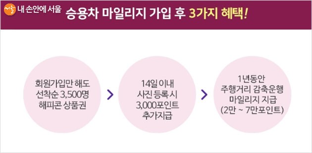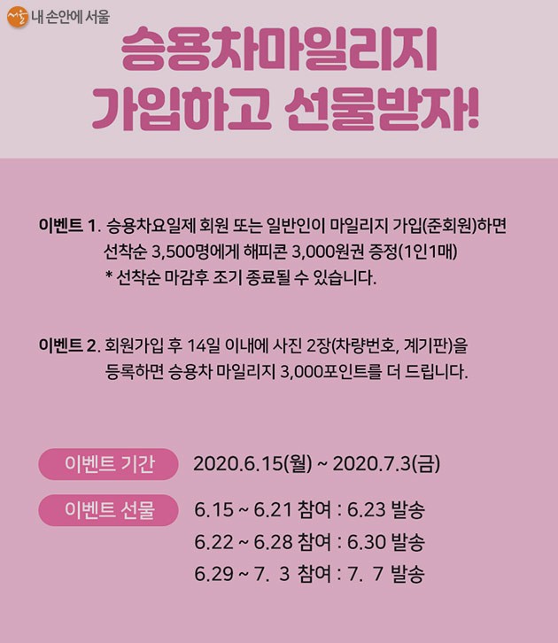 서울시는 일반 시민을 대상으로 가입 특별 이벤트를 진행하고 있네요. 6월 15일부터 7월 3일까지 기존 요일제 회원이 마일리지제로 전환하거나, 일반시민이 신규로 마일리지에 가입하면 선착순 3,500명에게 3,000원 상당의 모바일 상품권을 증정하네요