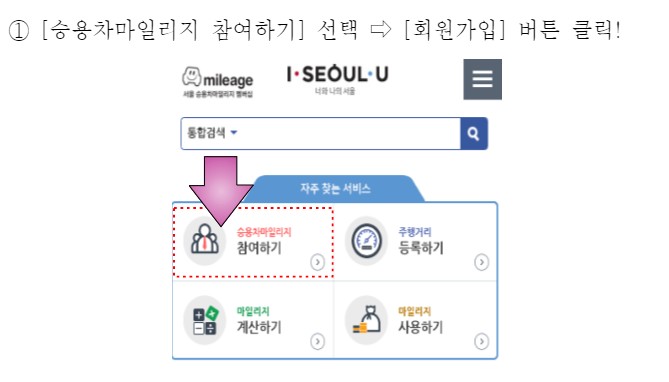 승용차 마일리이 화면이네요. 중앙 하단에 보시면 서울시민 자율 참여 회원 가입 아이콘이 있네요 해당 아이콘을 클릭해주세요.