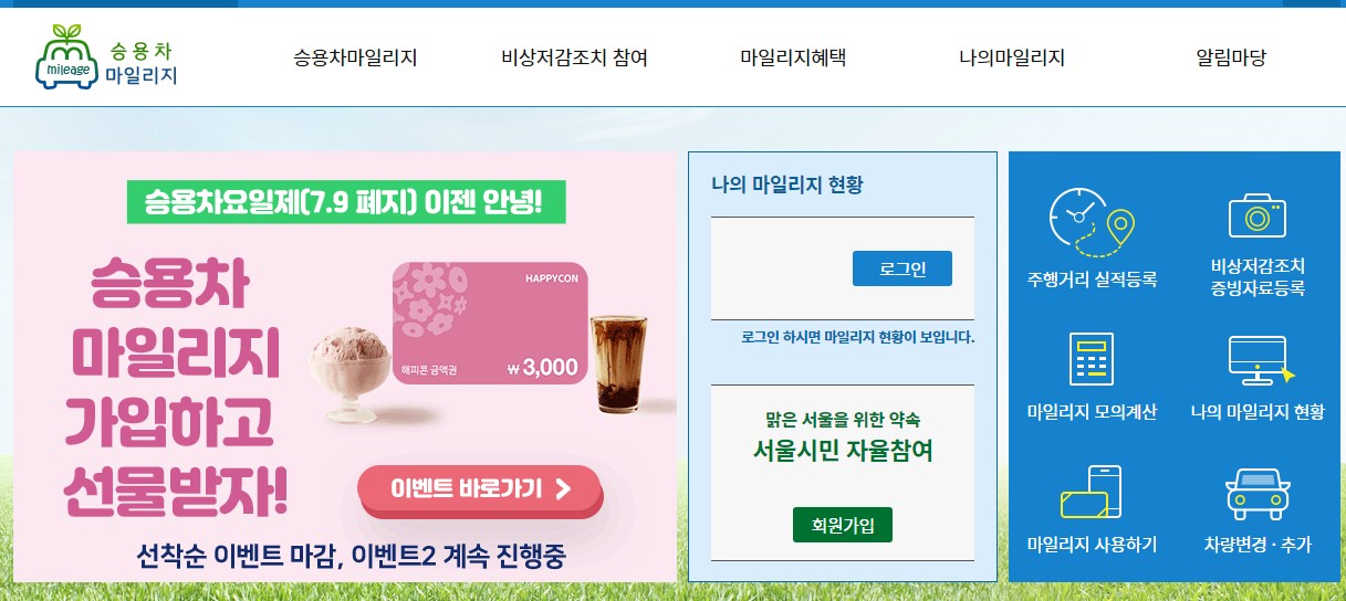 오늘은 서울시에서 승용차 요일제 대신에 내놓은 승용차 마일리지에 대해서 자세히 설명드릴게요 서울시는 서울의 공기질개선과 온실가스 감축을 위해 운영됐던 승용차요일제가 승용차 마일리지제로 바꿔 운영할 예정이네요. 7월 8일부터는 승용차요일제 혜택을 종료되고 ‘승용차 마일리지제’로 일원화 운영될 예정이네요. ‘승용차 마일리지제’는 자동차 주행거리(km)를 실질적으로 감축한 차량에 인센티브를 주는 제도로 운영되며 서울시가 지난 2017년 도입했었네요. 가입 이벤트도 진행되는 만큼 승용차 마일리지 가입하고 혜택도 누리시길 바랄게요. 이처럼 좋은 제도를 활용해서 매년 한번씩 작은 금액이라도 받을수 있다면 정말 재미있을것 같네요 본인이 받을수 있는 혜택이 있다면 놓치지 말고 꼭 받으시길 바랄게요 그게 남는거 아닐까요 오늘은 이러한 서울시 승용차 마일리지에 대해서 가입 방법 및 혜택 등에 대해서 설명해놓았으니 끝까지 읽어주시고 혜택도 받아가시길 바랄께요 지금 이벤트도 하고 있네요.